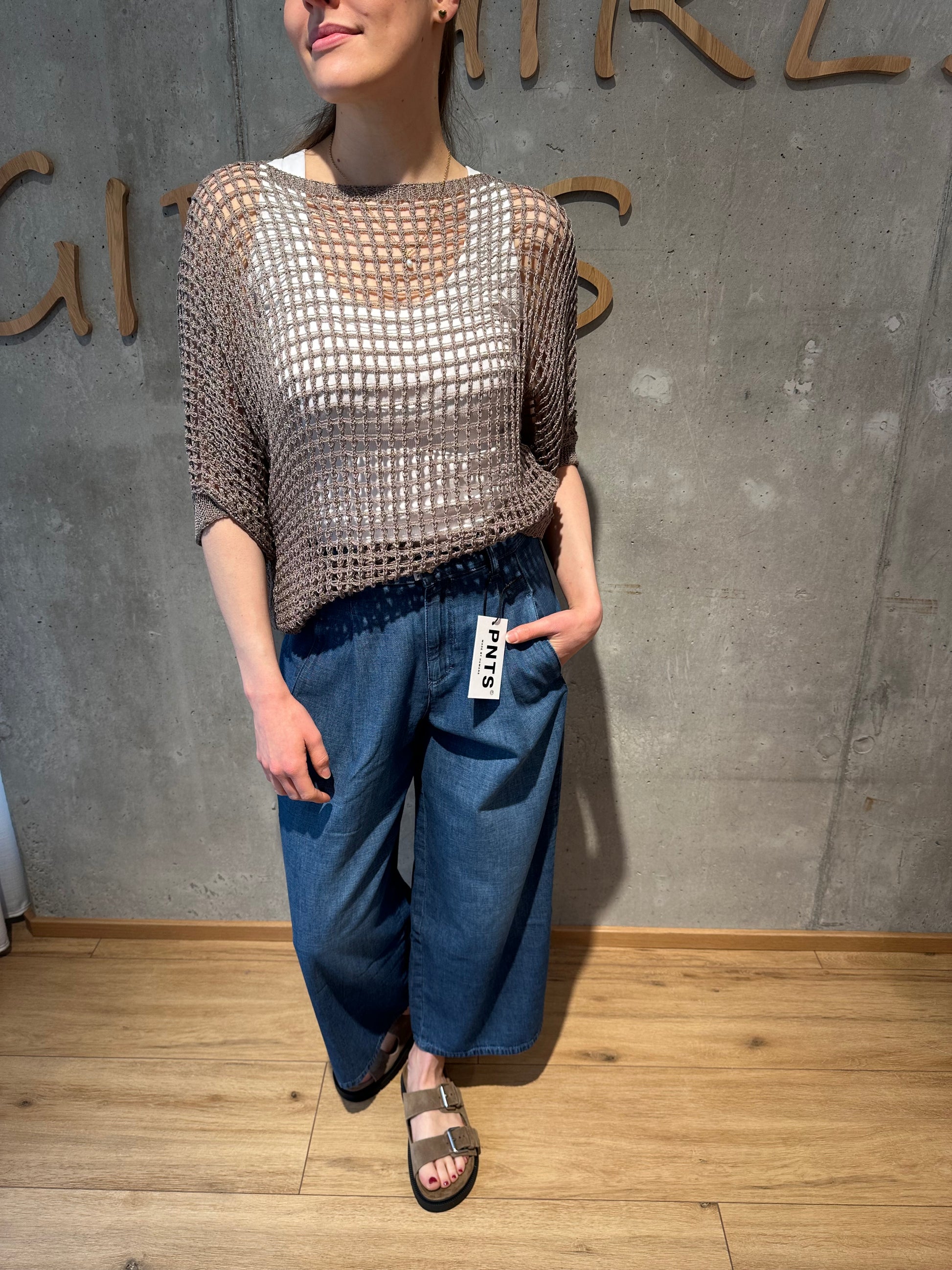 Lochstrick bzw. Netzstrick-Pullover mit halbem Arm.