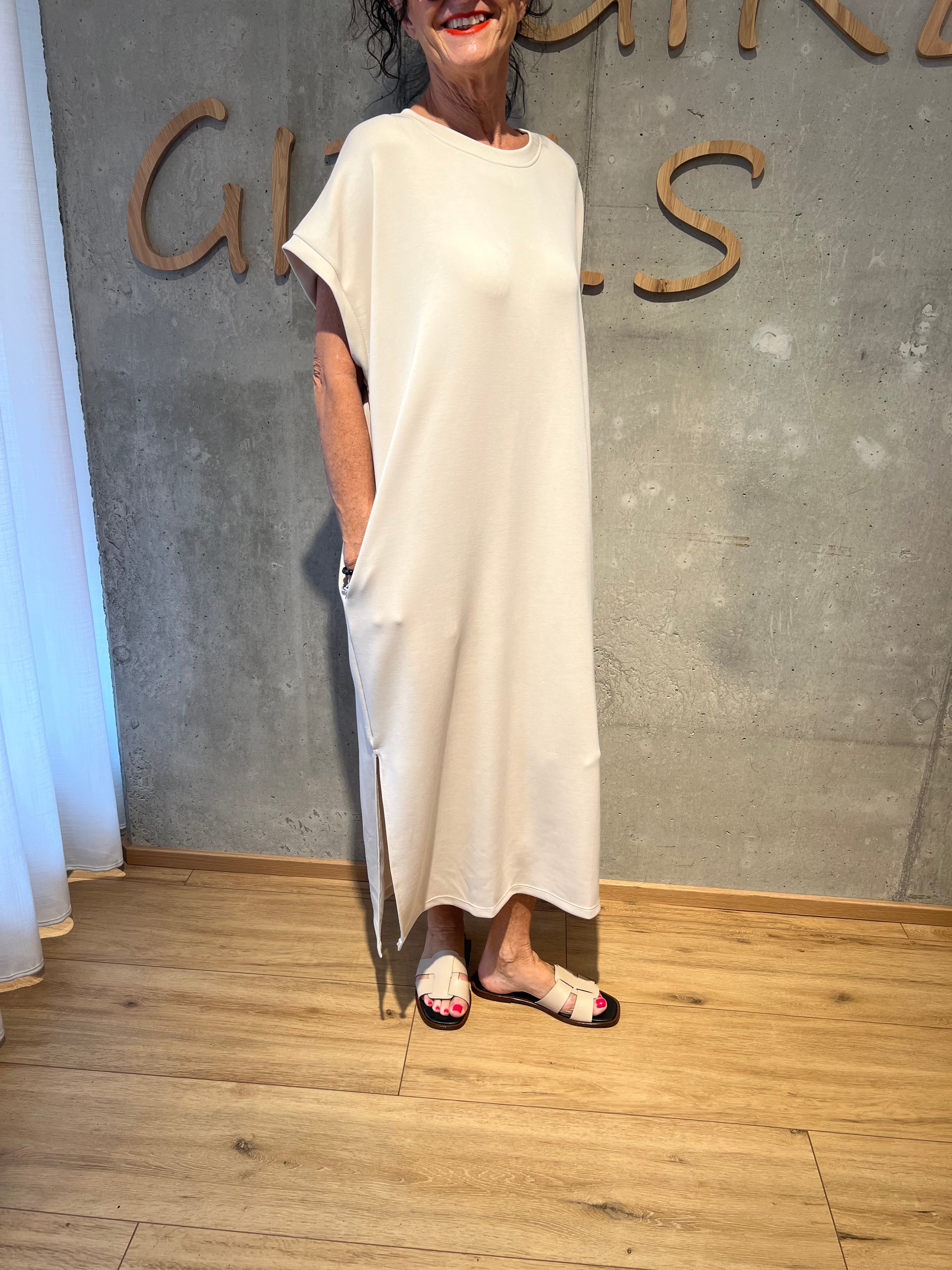 Das lange Modell hat einen kurze, überschrittenen Ärmel, Taschen an den Seiten und Schlitze an der Seite, ist weiter geschnitten und geht ungefähr bis zur Wade.