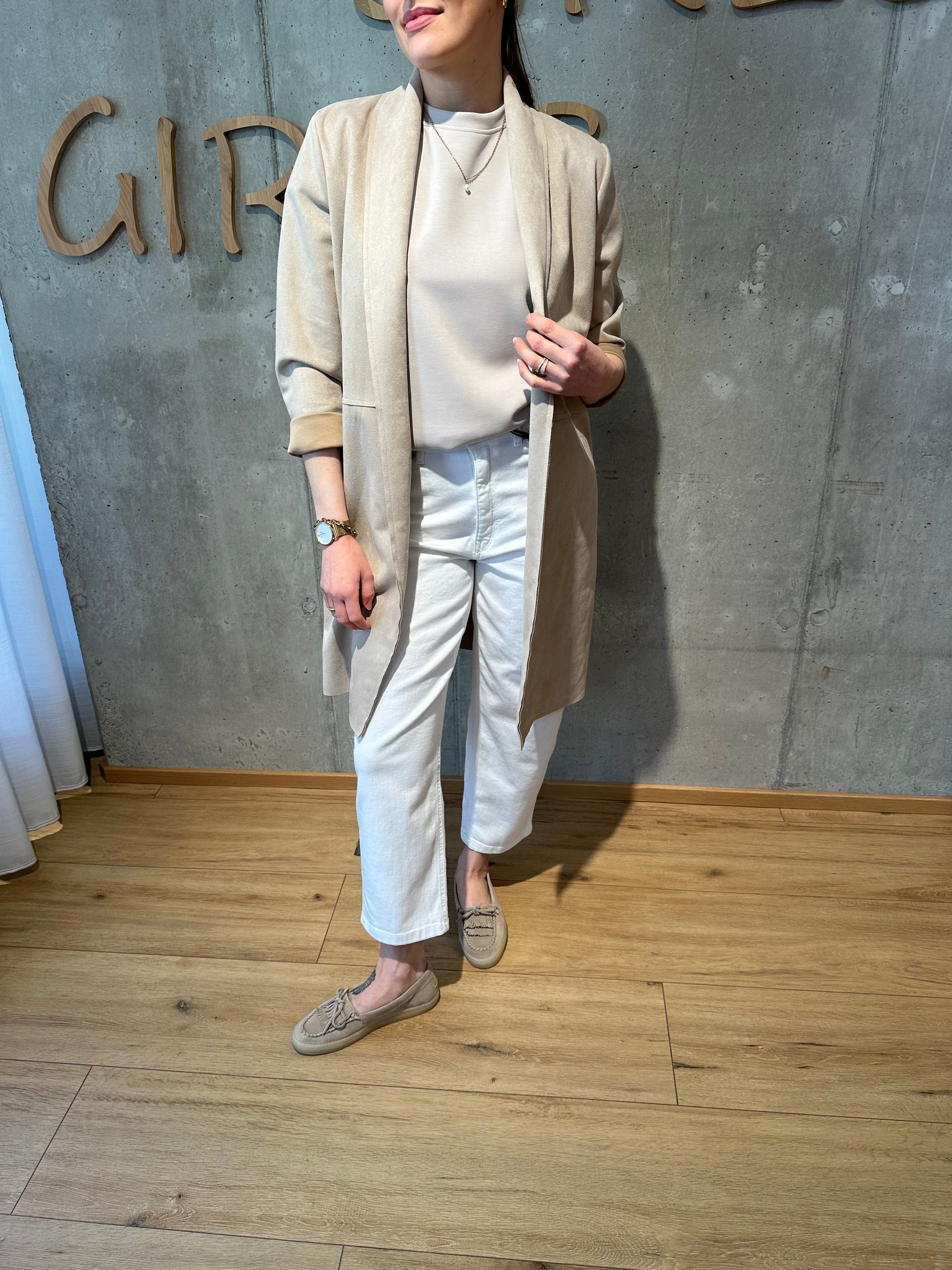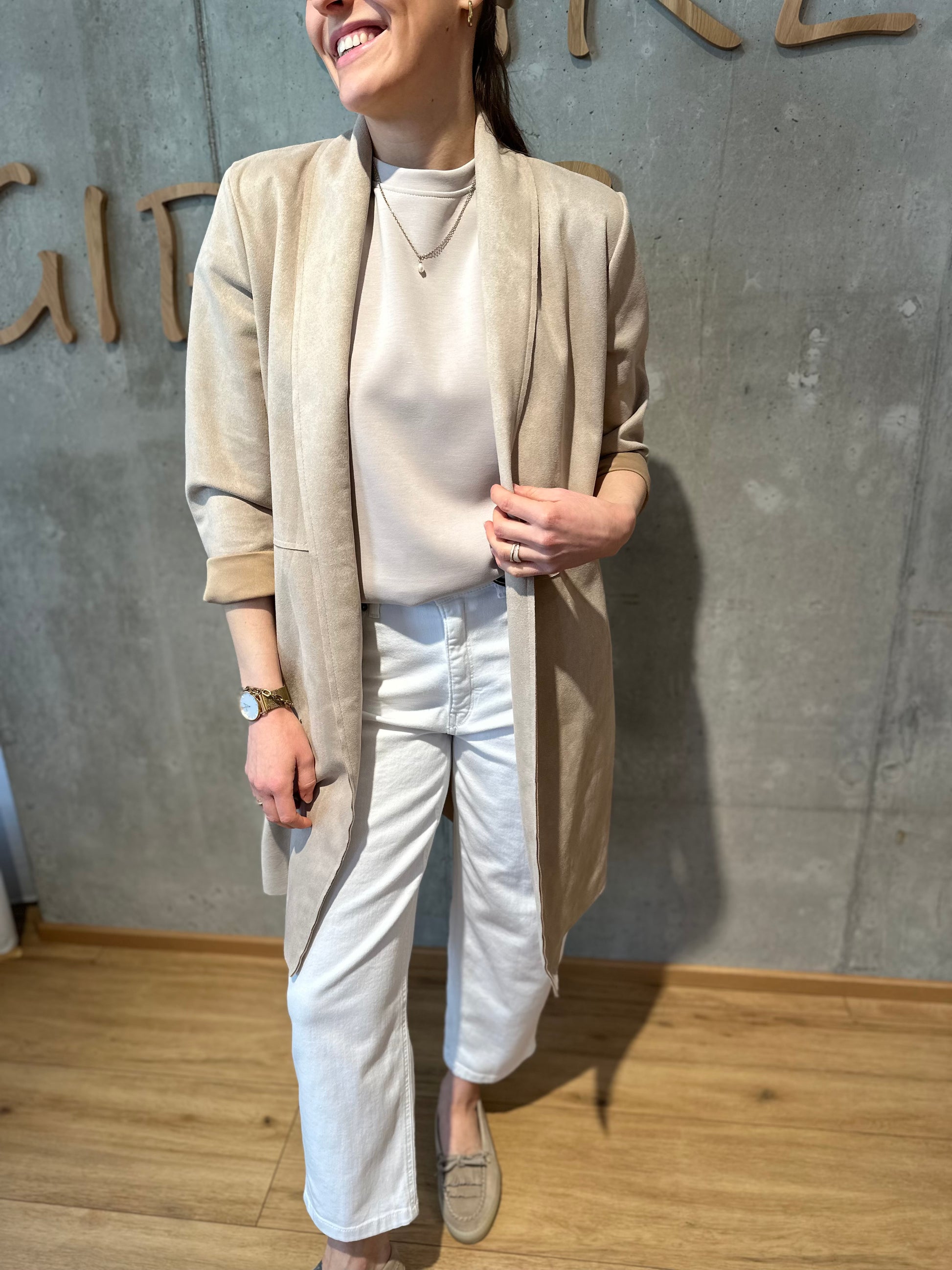 Offener Wildlederoptik-Mantel. Bei 1,70 m geht er bis zum Knie