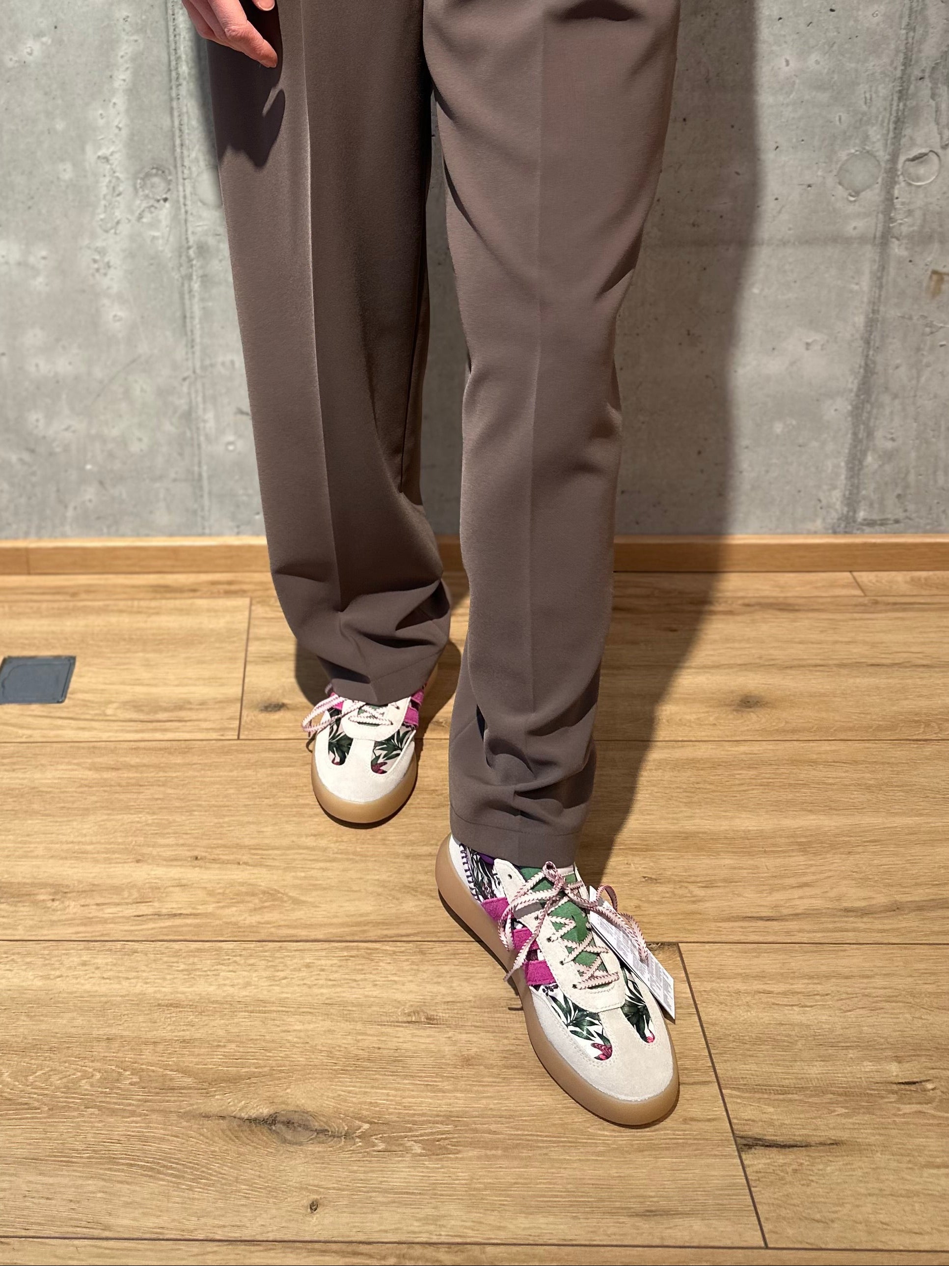 Grundfarbe ist beige mit grüner Zunge, lila Innenfarbe und pinken Wildleder Adidasstreifen. An den Seiten ist eine Dschungelmusterung mit Pflanzen und Papageien. Die Schnürsenkel sind beige mit pinkem Faden.